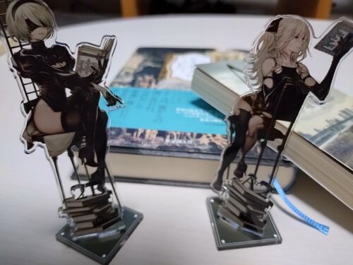 書店コラボの2BとA2のアクスタが届いたよ~。 今読んでる本と一緒に撮ったんだけど、肝心のアクスタが暗い・・・アクスタ撮る時どうあっても暗くなってしまう。 アクスタはメメモリくらいしか買ったことないから、枠付きのは初めて。ロゴ印刷されたこんなし…