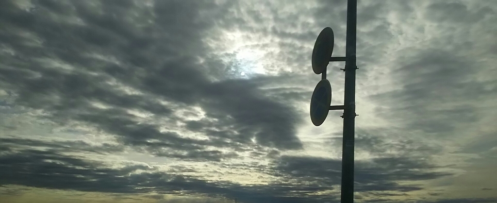助手席からの眺め。橋の上。前方は真っ青な空に白くて大きい雲が流れていたのに、左側を見るとこんなだった。ファンタジックな曲を聞いてたので気分はRPG。